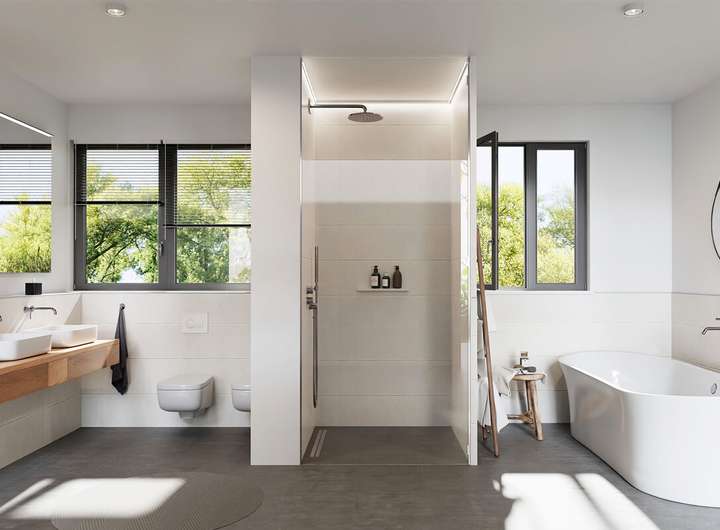 Im Erdgeschoss empfängt Sie eine geräumige Eingangsdiele mit Zugang zum Hauswirtschaftsraum sowie einem separaten Gäste-WC. Geradeaus öffnet sich der beeindruckende, über 55 m² große Wohn- und Essbereich, der nahtlos in die offene Küche mit weiteren über 15 m² übergeht. Hier bietet sich ausreichend Platz für eine moderne Einbauküche mit allen Elektrogeräten sowie eine Kochinsel als zentralen Treffpunkt. Große Fensterflächen sorgen für helle, freundliche Räume und ein angenehmes Wohnambiente.