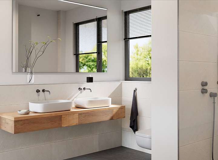 Das Obergeschoss erreichen Sie über eine gerade Treppe. Hier erwartet Sie eine offene Galerie, drei weitere großzügige Schlafzimmer, ein Abstell- bzw. Hauswirtschaftsraum sowie zwei moderne Badezimmer mit Dusche, WC und Waschtisch.