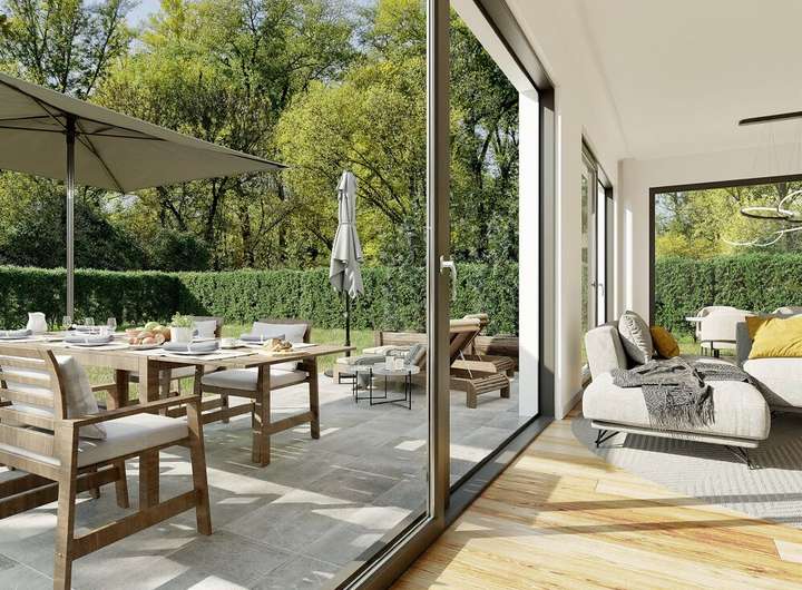 Vom Wohnbereich aus gelangen Sie über eine Schiebetür direkt auf die Terrasse und in den Garten – ideal für entspannte Stunden im Freien.
