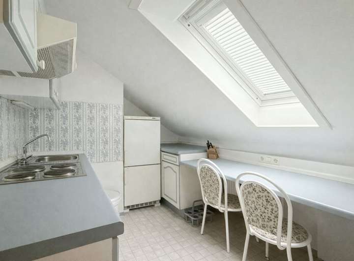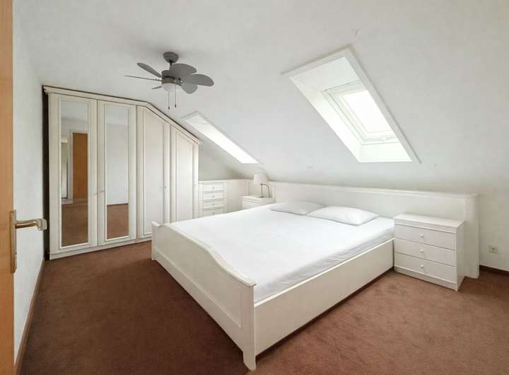 Im Dachgeschoss befindet sich eine weitere Wohneinheit mit zweieinhalb Zimmern. Die DIN-Wohnfläche beträgt nach Abzug der Dachschrägen ca. 46 m². Diese Wohnung umfasst einen Wohnbereich, eine Küche, ein Tageslichtbad, ein Schlafzimmer sowie einen kleinen, separaten Bereich, der sich ideal als Arbeitszimmer eignet.