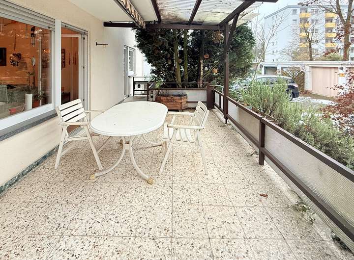 Im Erdgeschoss befindet sich eine großzügige Drei-Zimmer-Wohnung mit einer Wohnfläche von knapp 100 m². Diese Einheit verfügt über eine Wohnküche, ein modernes Duschbad sowie eine große, sonnige Terrasse mit direktem Bezug zum Gartenbereich.