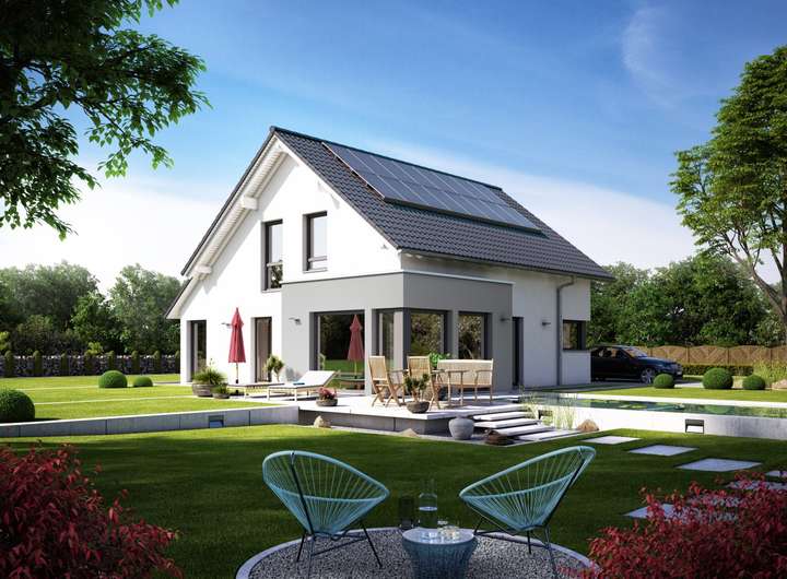 Kompromisse waren gestern, mit diesem Einfamilienhaus werden deine Eigenheimträume wahr. Dieses individuell gefertigte Fertighaus von Living Haus bringt alle Vorzüge moderner Architektur und flexiblen Wohnens zusammen. Mit einer Wohnfläche von 143 Quadratmetern auf zwei Etagen bietet es ausreichend Platz für Familien und Freiraum für Kreativität. Das klassische Satteldach mit einer Neigung von 38 Grad verleiht dem Haus einen zeitlosen Charakter, während die Erker den Wohnraum erweitern und durch bodentiefe Fenster viel natürliches Licht hereinlassen.