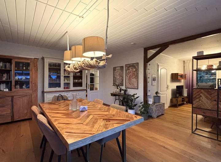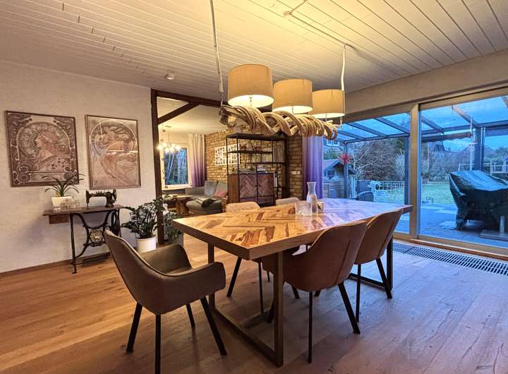 Der großzügige Wohn- und Essbereich bildet das Herzstück des Hauses. Er ist, wie auch die anderen Wohnräume mit einem hochwertigen Eichendielenboden ausgestattet, der dem Raum eine warme, zeitlose Atmosphäre verleiht. Eine große Fensterfläche sorgt für Helligkeit und einen harmonischen Blick in den Garten. Von hier aus besteht direkter Zugang zur überdachten Terrasse, die den Wohnraum in den Sommermonaten erweitert und zu entspannten Stunden im Freien einlädt.