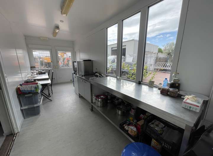 Zusätzlich stehen umfangreiche Gewerbe- und Freiflächen zur Verfügung, darunter eine Bäckerei/Kiosk in Containerbauweise, weitere Gewerbeflächen, eine Halle, Lagercontainer, Garagen sowie mehrere Stellplätze. Ein Teil der Freiflächen ist separat vermietet.