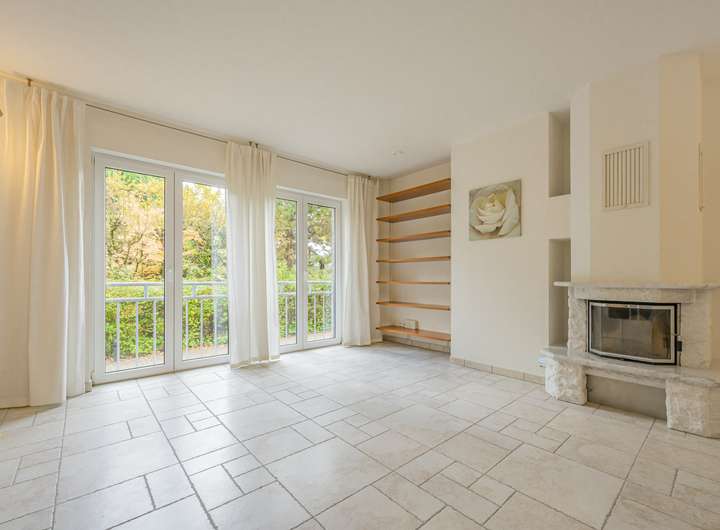 Wohn- und Kaminzimmer mit bodentiefen Fenstern, die den Raum mit viel Licht durchfluten.