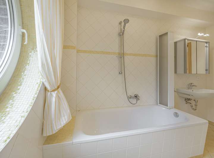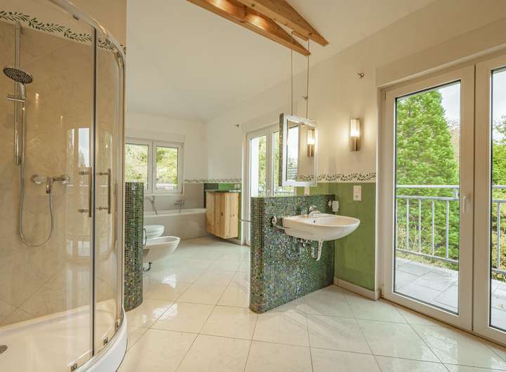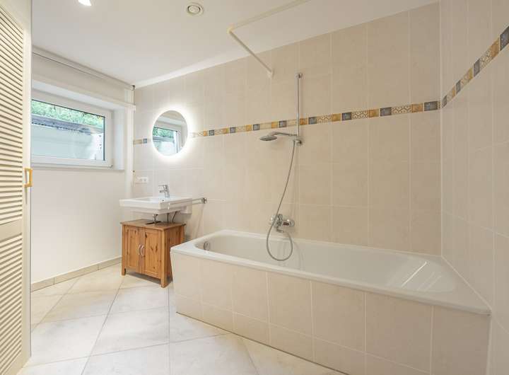 Alle Bäder im Haus sind hell gestaltet und mit großformatigen Fliesen ausgestattet, die einen