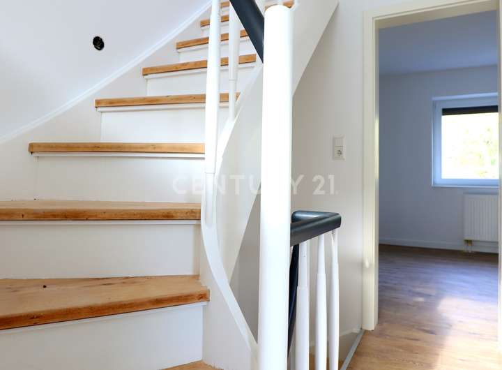 - Treppenhaus: Sanierte Holzstufen in Eichenoptik mit modernen Handläufen