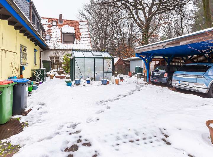 Direkt vor dem Haus befindet sich großes Doppel-Carport mit Wallbox, ein neuwertiges Gewächshaus und ein neuwertiges Metallgerätehaus.