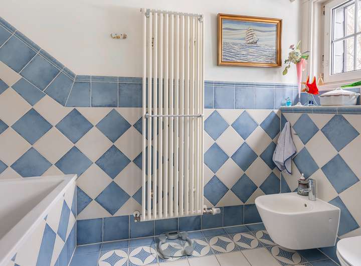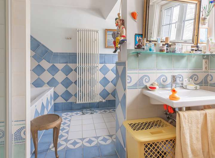 - großes, weiß/blau gefliestes Vollbad mit separater Dusche und 2 Fenstern