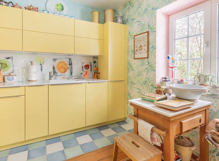 Durch die Pitchpineböden kombiniert mit außergewöhnlichen Bodenfliesen entsteht ein ungewöhnlicher und ansprechender Charme.