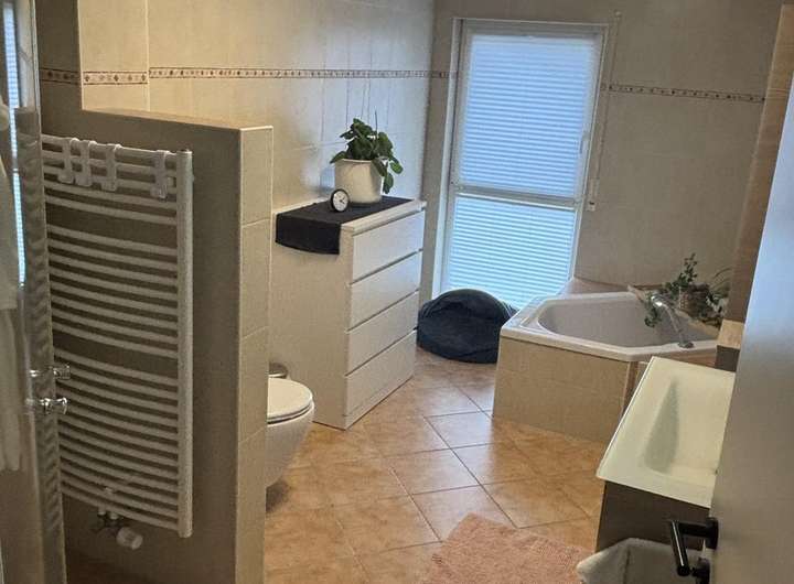 Im Obergeschoss stehen zwei gut geschnittene Schlafzimmer zur Verfügung, von denen sich eines ideal als Kinderzimmer oder Home-Office eignet. Das großzügige Badezimmer ist mediterran gestaltet und mit einer Eckbadewanne sowie einer ebenerdigen Dusche ausgestattet - ein Ort der Entspannung.