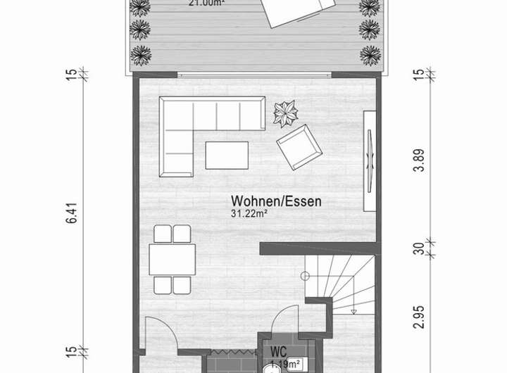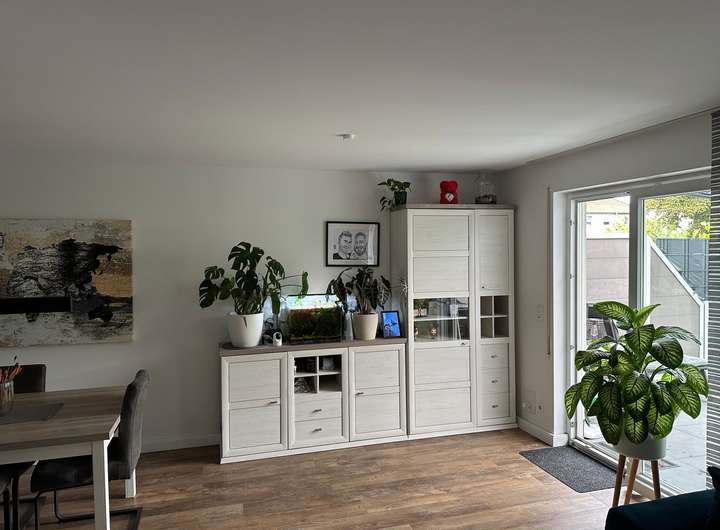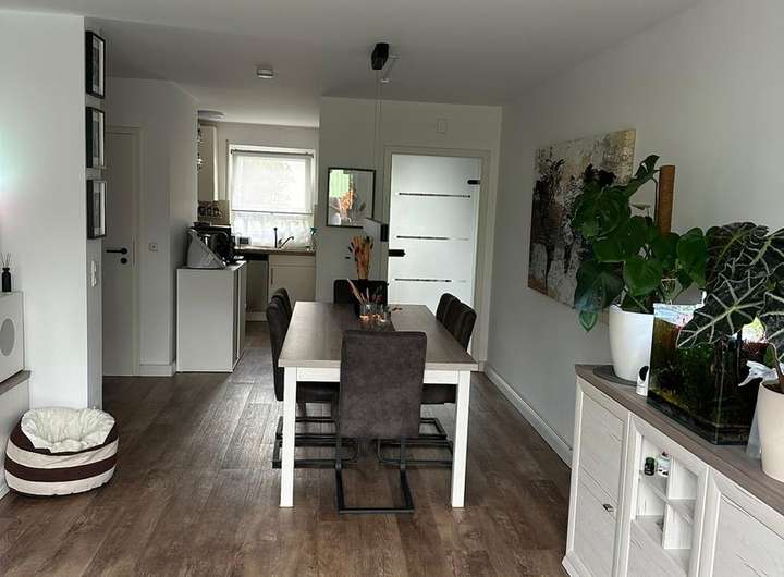 Das Erdgeschoss bildet mit dem offenen Wohn- und Essbereich das Herzstück des Hauses. Große Fensterfronten lassen viel Tageslicht herein und eröffnen einen schönen Blick in den 2024 neu gestalteten, blickdichten Garten. Die Küche ist offen integriert und bietet kurze Wege sowie eine kommunikative Wohnatmosphäre. Direkt angrenzend befindet sich ein praktischer Hauswirtschaftsraum mit Platz für Vorräte, Waschmaschine und Trockner. Ein Gäste-WC ergänzt das Raumangebot auf dieser Ebene.