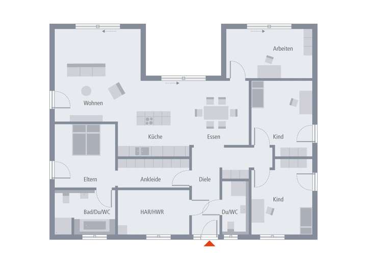 Ein bis ins kleinste Detail durchdachtes Raumwunder ist der Bungalow 3 mit seiner Wohnfläche von knapp 150 m2. Hier finden Familien mit bis zu zwei Kindern Platz und haben zudem noch die Möglichkeit, sich ein eigenes Büro oder alternativ einen Hobbyraum einzurichten. Durch die symmetrische Grundrissgestaltung mit einem Rückversatz entsteht im Außenbereich ein vor Blicken geschützter Bereich, der sich perfekt als Terrasse und damit als Rückzugsort eignet. Der Zugang ist möglich durch den großen und hellen Wohn-Essbereich mit integrierter Küche. Diese ist so konzipiert, dass das Einbinden einer Kochinsel problemlos möglich ist und als idealer Raumteiler zwischen Wohn- und Essbereich fungieren kann. Das Arbeitszimmer ist von hier ebenfalls erreichbar. Über die Diele führt der Weg in die beiden Kinderzimmer, für das ein eigenes Bad mit Dusche und WC zur Verfügung steht. Zum Reich der Eltern gehören neben dem Schlafzimmer ein sich direkt anschließendes Bad sowie Ankleidezimmer. Komplettiert wird das Raumangebot durch einen großen Hauswirtschaftsraum.