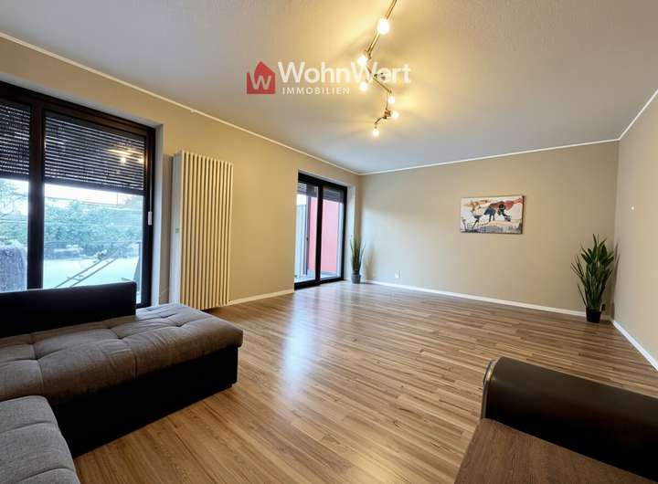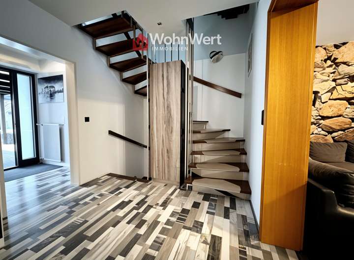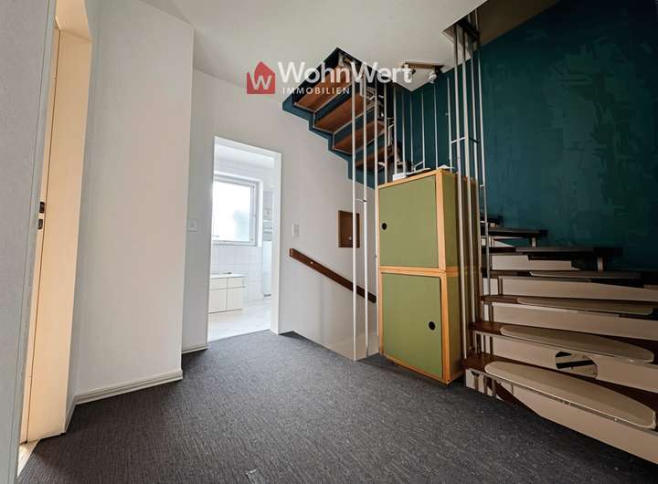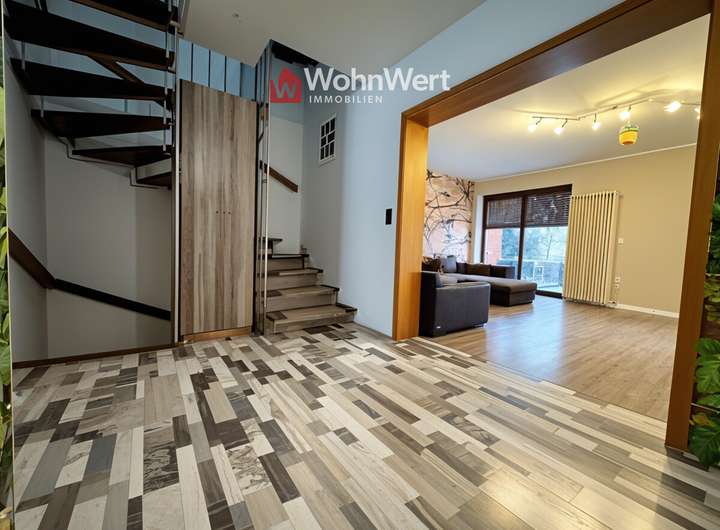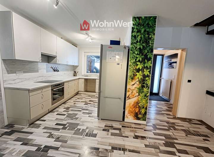 Im Erdgeschoss befindet sich ein großzügiges Wohnzimmer mit Blick in den Garten sowie Zugang zur schönen Terrasse. Der Wohnbereich ist hell und offen gestaltet und bildet den zentralen Lebensmittelpunkt des Hauses. Angrenzend befindet sich eine halb offene Küche, die funktional in den Wohnbereich integriert ist und kurze Wege ermöglicht.