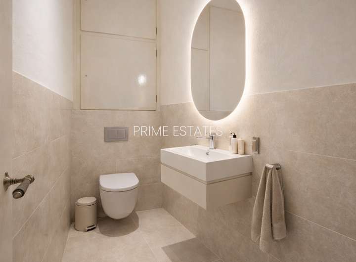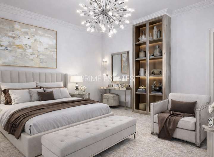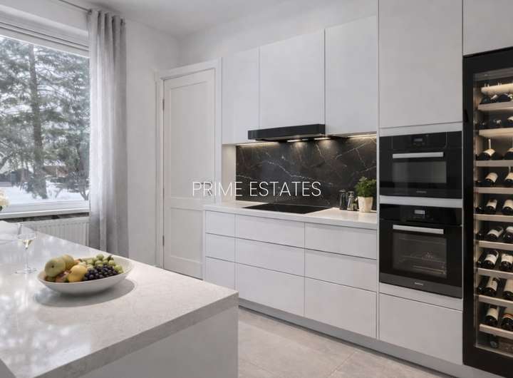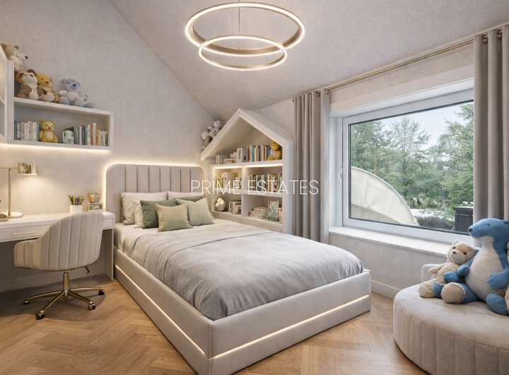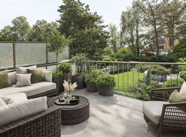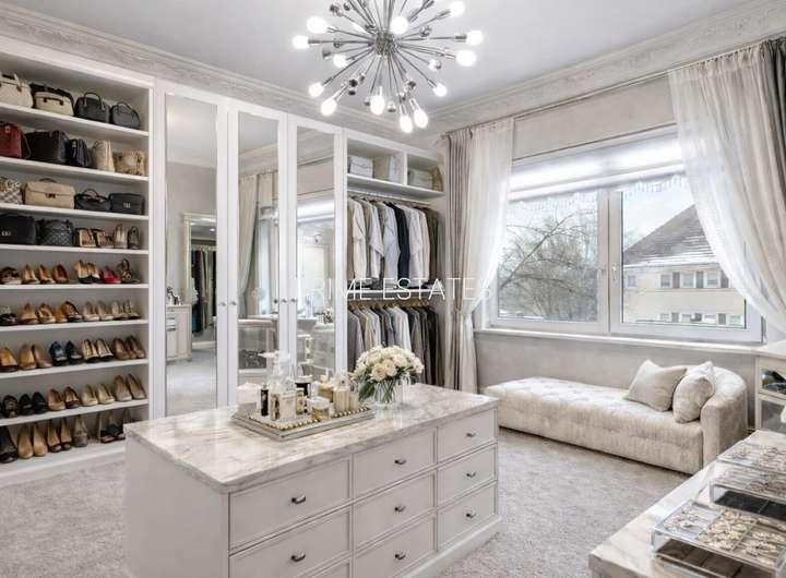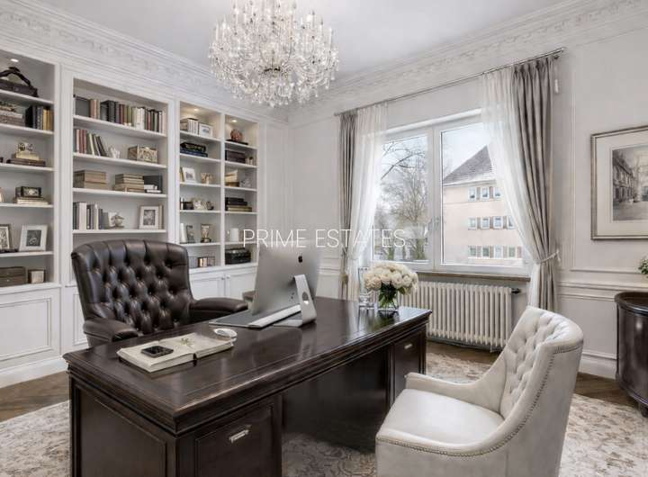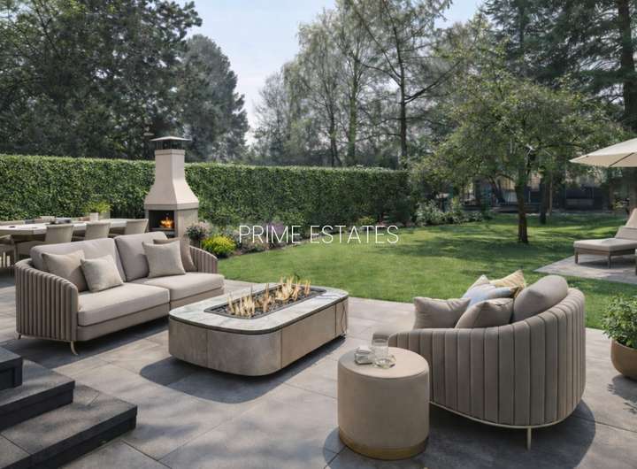 Auch Küche, Bäder, Gäste-WC sowie der Eingangsbereich und das Treppenhaus zeigen im Bestand ihren ursprünglichen Charakter, während die beigefügten Visualisierungen eindrucksvoll veranschaulichen, wie stilvoll, modern und luxuriös diese Räume nach einer behutsamen Modernisierung wirken können. Gleiches gilt für den Garten, der im jetzigen Zustand zurückhaltend erscheint, in den gestageten Bildern jedoch als privates Outdoor-Paradies mit großzügigen Terrassen und grünen Rückzugsorten erlebbar wird.