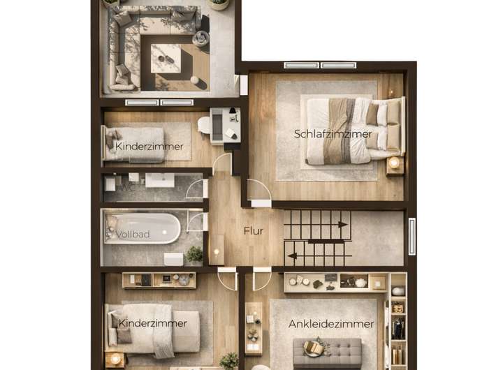 Ein besonderes Highlight bildet der großzügige Wohnbereich, der sich über drei miteinander verbundene Räume erstreckt. Das Esszimmer, Kaminzimmer und Wohnzimmer. Das Kaminzimmer als zentraler Mittelpunkt verbindet die Bereiche harmonisch miteinander. Der historische Kachelofen ist bereits im Ist-Zustand ein beeindruckendes Originalstück und wird in den Visualisierungen zum eleganten Herz eines modernen Wohnkonzepts. Große Fensterflächen sorgen schon heute für viel Tageslicht und unterstreichen die Offenheit dieser Ebene.