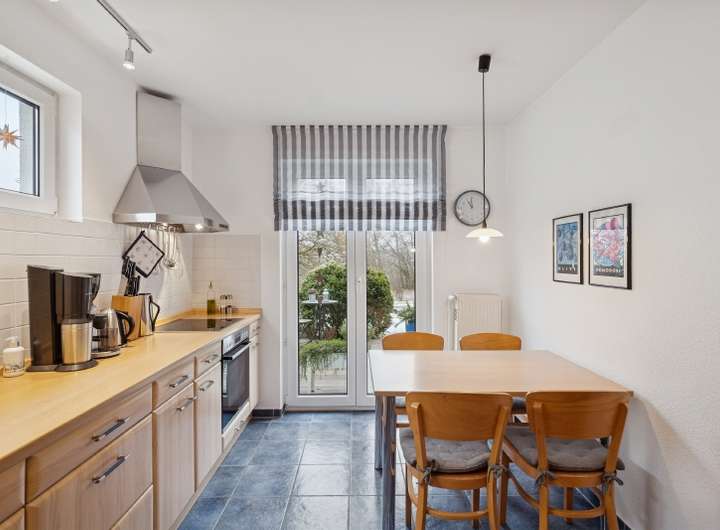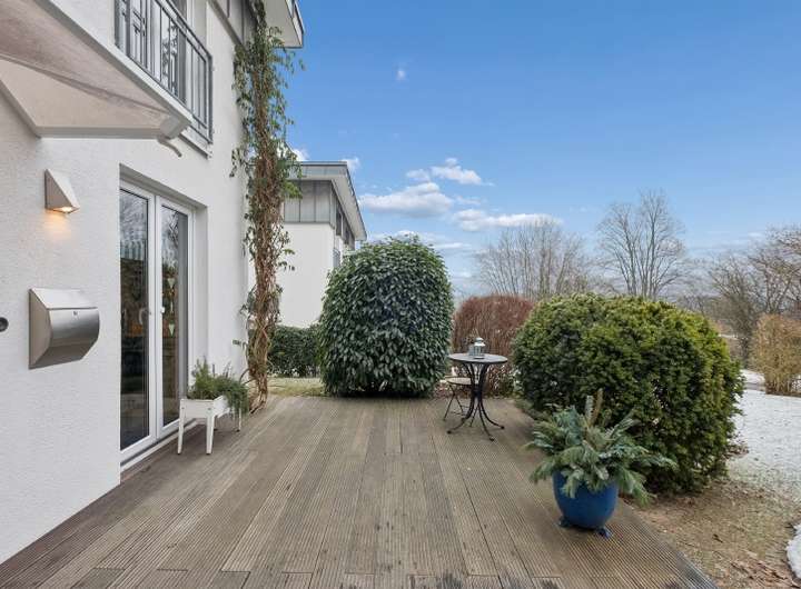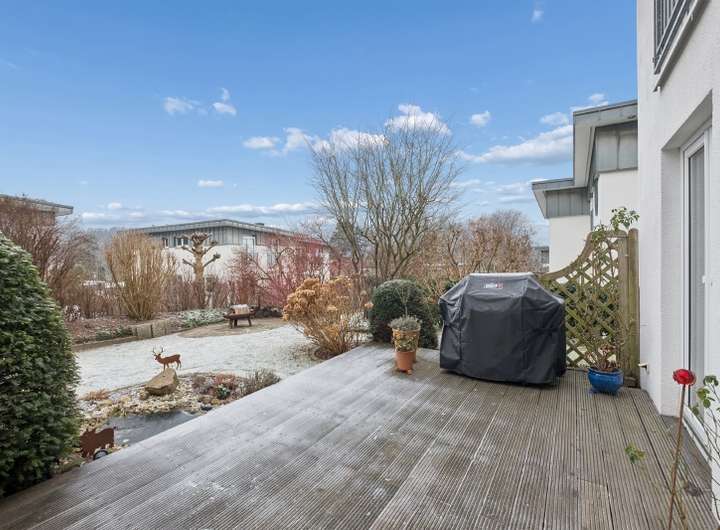 Zwei großzügige Terrassen laden zum Verweilen ein: Auf der Ost-Terrasse starten Sie entspannt in den Tag bei einem Frühstück in der Morgensonne, während die sonnige West-Terrasse den perfekten Rahmen für gemütliche Abendstunden bietet. Beide Terrassen sind mit Bangkirai-Holzdecks ausgestattet. Der unmittelbar angrenzende Wald erweitert den Garten optisch und funktional – ob Spaziergänge, Joggingrunden, Fahrradtouren oder einfach nur Abschalten im Grünen, hier beginnt Erholung direkt vor der Haustür. Eine eigene Garage auf einem gemeinsamen Garagenhof sorgt für bequemes Parken.