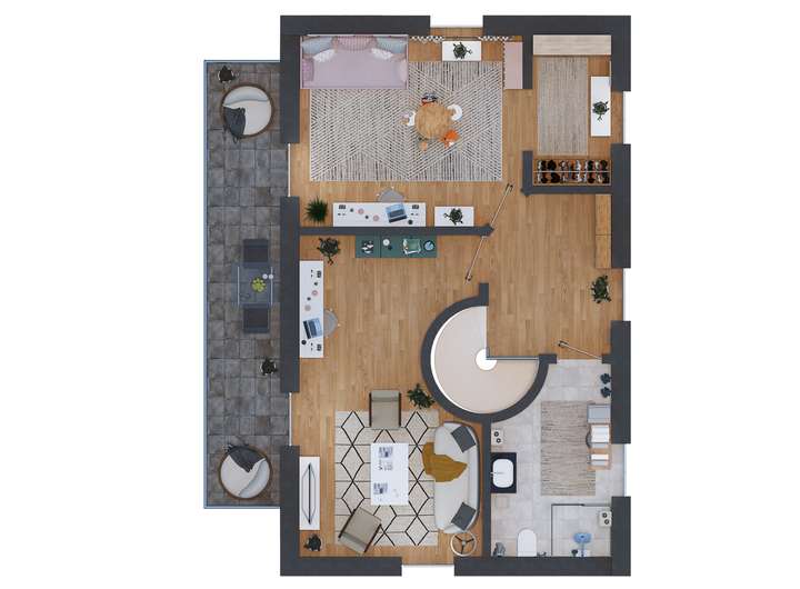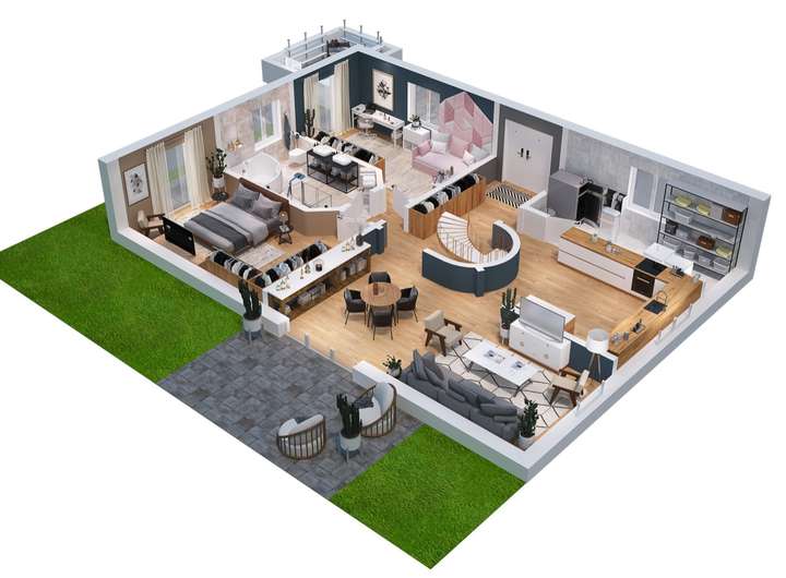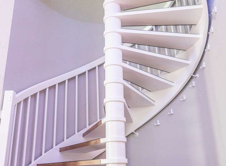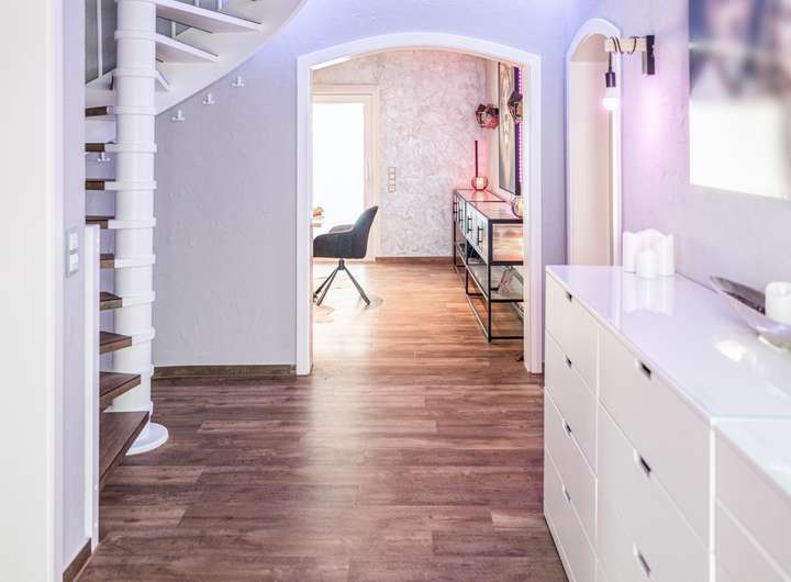 Eine elegante, offene Holz-Wendeltreppe verbindet das Erdgeschoss mit dem Dachgeschoss und setzt dabei einen architektonischen Akzent im Dielenbereich. Die runde Form der Treppe sorgt nicht nur für einen harmonischen Übergang zwischen den Etagen, sondern verleiht dem Raum auch eine besondere Großzügigkeit und Leichtigkeit. Durch das offene Design wirkt der Treppenaufgang luftig und modern, während hochwertige Materialien und eine sorgfältige Verarbeitung das exklusive Ambiente unterstreichen.