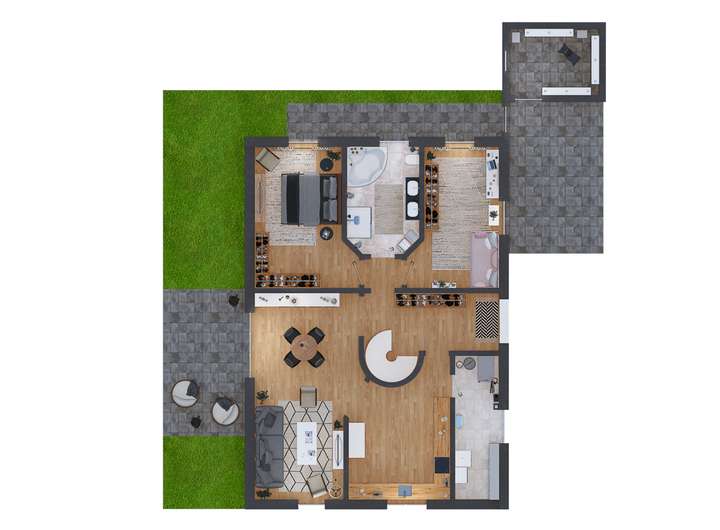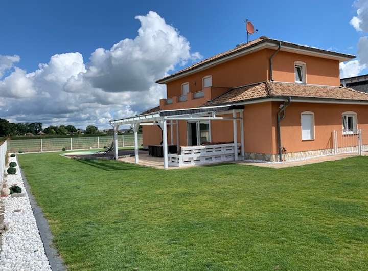 Der Außenbereich lädt zum Entspannen ein: Die überdachte Terrasse mit ca. 15 m² bietet einen geschützten Platz für gemütliche Stunden im Freien – unabhängig vom Wetter. Besondere Highlights im Garten sind der eingelassene Rundpool (3,5 m x 1,2 m) sowie der überdachte Premium-Whirlpool (Wellis Modell „Palermo“) inklusive zusätzlicher 7 kW Luftwärmepumpe für bis zu 5 Personen, mit integrierten LEDs und 2.1 Soundsystem – für harmonische Stunden zu zweit oder mit der ganzen Familie. Die Terrasse ist mit manuell bewegbaren Markisen ausgestattet, die flexiblen Sonnen- und Wetterschutz bieten.