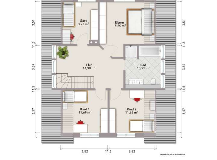 Flur, 2 Kinderzimmer, Gästezimmer, Elternschlafzimmer und Bad