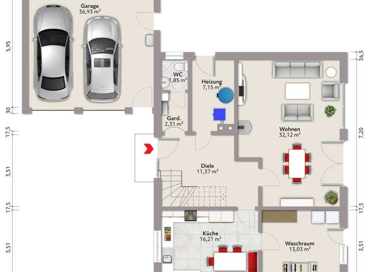 Diele, Küche, Hauswirtschaftsraum, Wohnzimmer, Heizungsraum, Garderobe und Gäste-WC