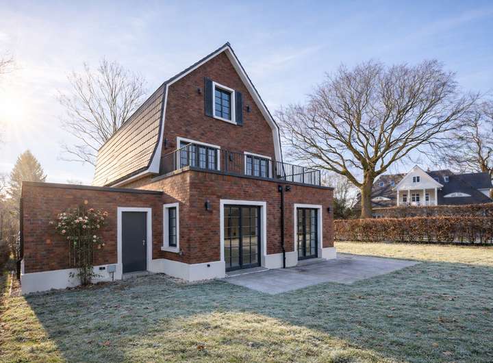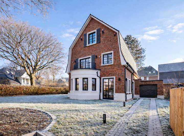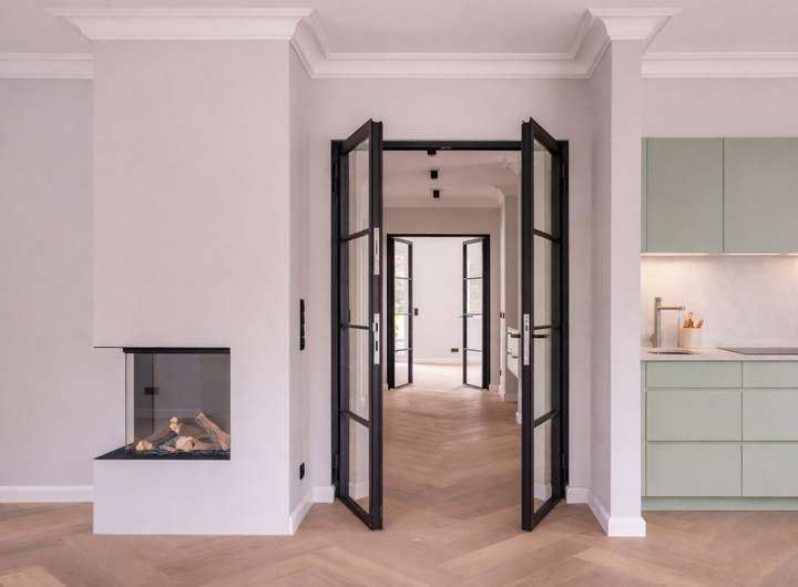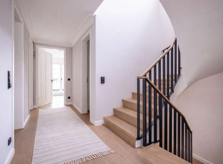Charakteristisch sind das geschwungene Mansarddach, ein Erker, schwarze Sprossenfenster und elegante Fensterläden. Innen erwarten Sie großzügige Raumhöhen, Fischgrätparkett, Eichendielen, maßgefertigte Einbauten sowie moderne Loft-Türen aus Stahl und Glas.