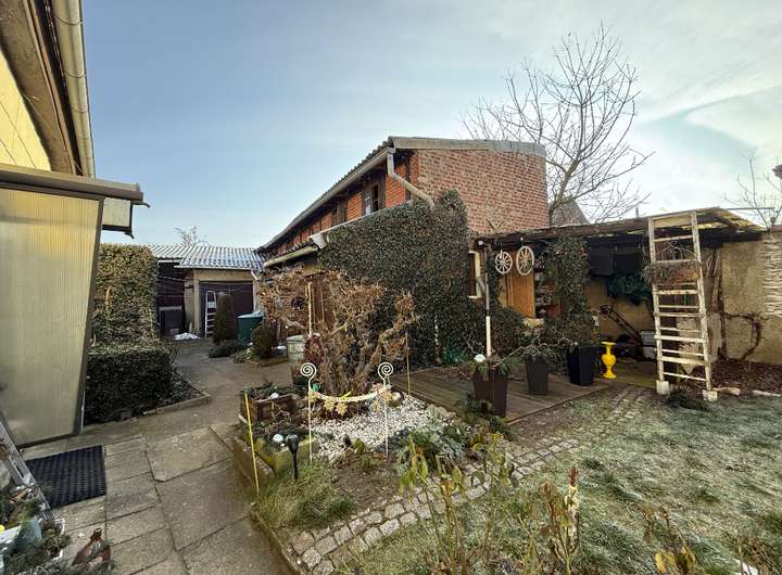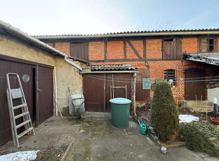 Die Nebengebäude auf dem Hof folgen dem Fachwerkcharakter und beherbergen aktuell Werkstatt- und Lagerräume. Trotz solider Bausubstanz weisen die Gebäude ebenfalls einen gewissen Renovierungsbedarf auf, bieten aber Potenzial für neue Ideen wie z. B. Home-Office, Gästehaus oder Spielbereich.