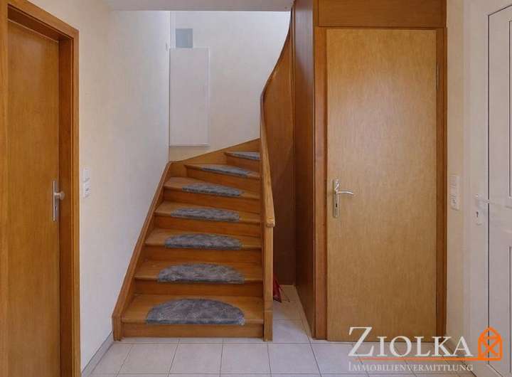 Eine seitliche Zuwegung führt zum Hauseingang. Dort ergibt sich zunächst ein Vorflur, über den sich die Zugänge zur primären Wohneinheit, zur zweiten Wohneinheit im Dachgeschoss über die Treppe sowie zum Keller ergeben.