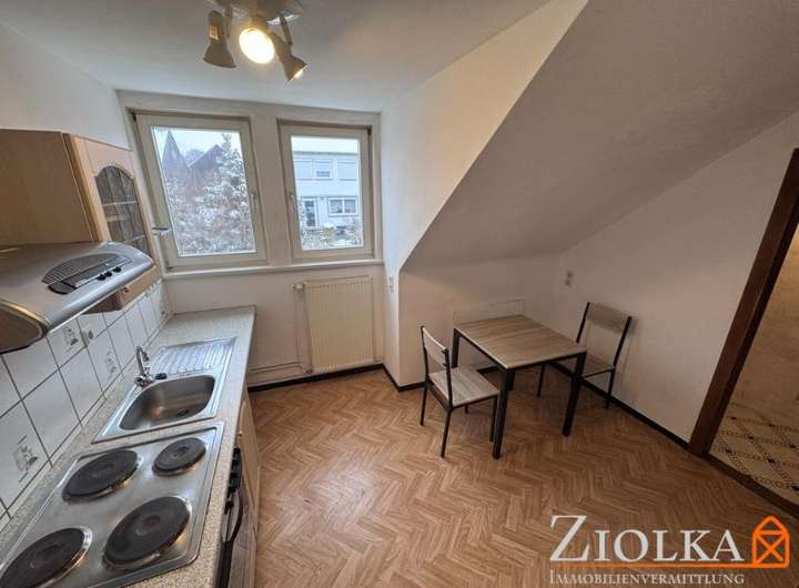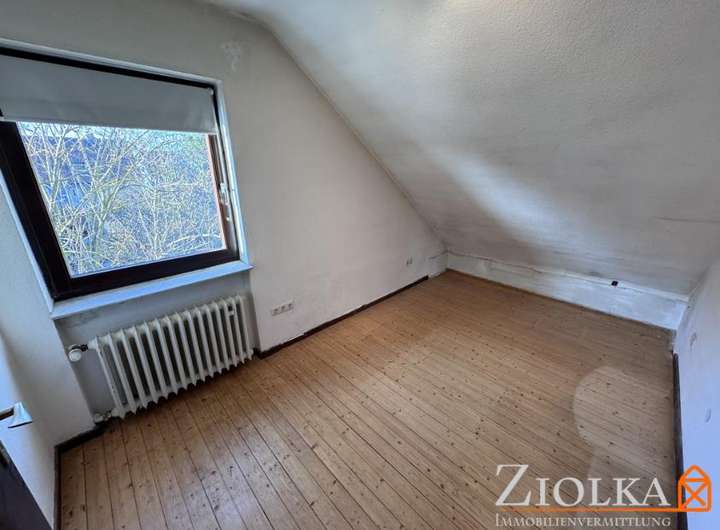 Die zweite Wohneinheit ist ausschließlich im Dachgeschoss gelegen, über einen separaten Treppenzugang aus dem Eingangsbereich zugänglich, und bietet derzeit mit rund 34,6 m² einen Flur, ein großes Zimmer sowie Küche, Bad und einen Abstellraum.