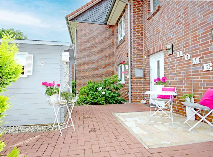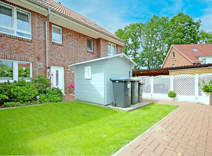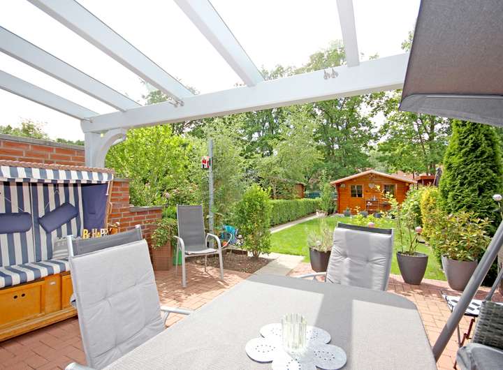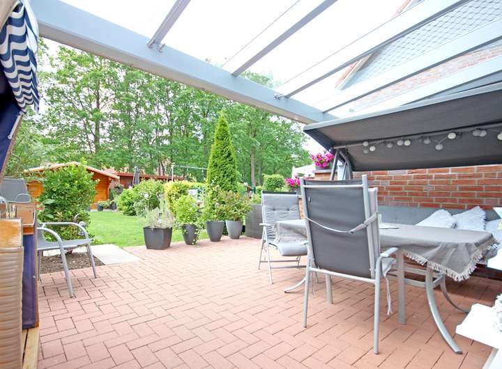 Der Garten präsentiert sich gepflegt und klar gegliedert, mit Rasenfläche, eingefassten Beeten und einem Gartenhaus für praktische Aufbewahrung. Mehrere Terrassenbereiche schaffen unterschiedliche Plätze für Essen, Spielen oder ruhige Stunden, teils überdacht und damit auch bei wechselhaftem Wetter gut nutzbar.
