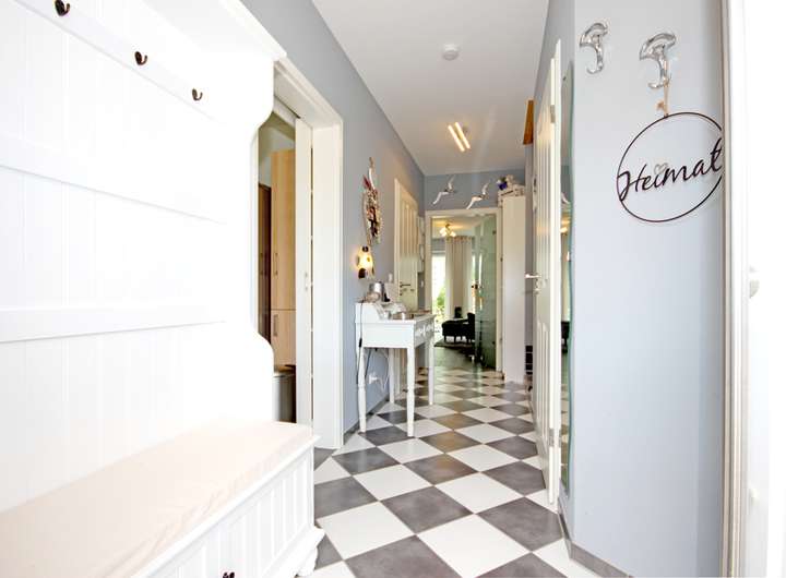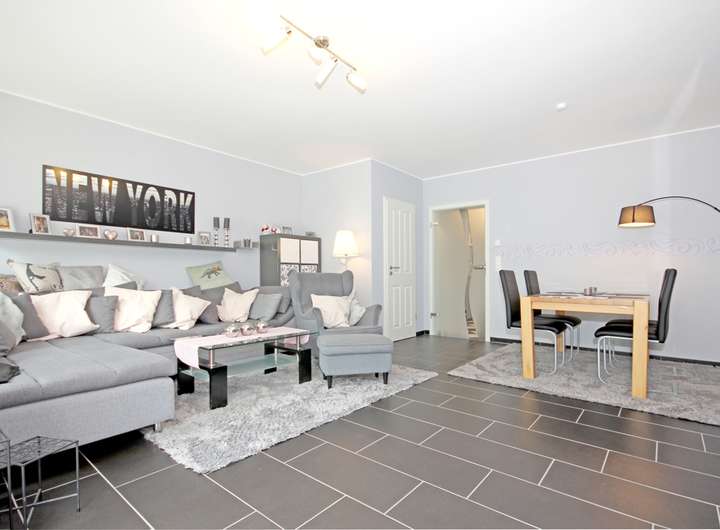 - Bodenbeläge innen gemischt aus großformatigen Fliesen im Wohnbereich und Flur sowie Laminat in Zimmern
