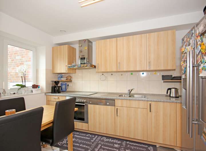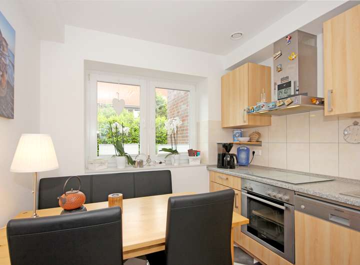 Die Küche bietet mit ihrer geradlinigen Einbauzeile sowie einem Essplatz eine angenehme, alltagstaugliche Atmosphäre. Helle Fronten, eine geflieste Arbeitszone und das Fenster über dem Sitzbereich unterstützen den klaren, gepflegten Eindruck.