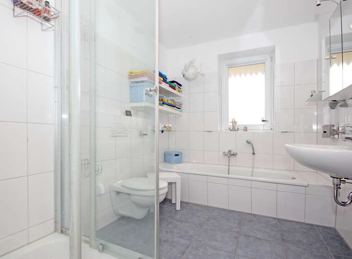 Zwei Badezimmer erhöhen die Alltagstauglichkeit spürbar. Ein Bad zeigt sich mit Badewanne und separater Dusche, Fenster und hellen Wandfliesen, während ein weiteres Bad als kompakte Ergänzung für Gäste oder den schnellen Start in den Tag dient.