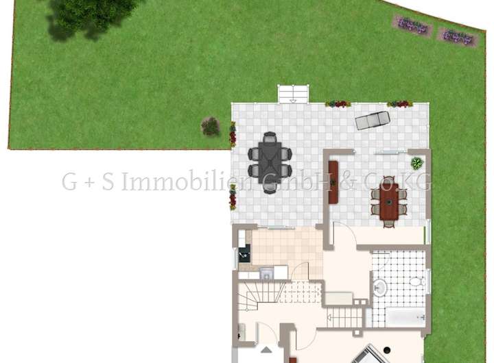 Vom Esszimmer erreicht man die Terrasse mit Zugang zum Garten.