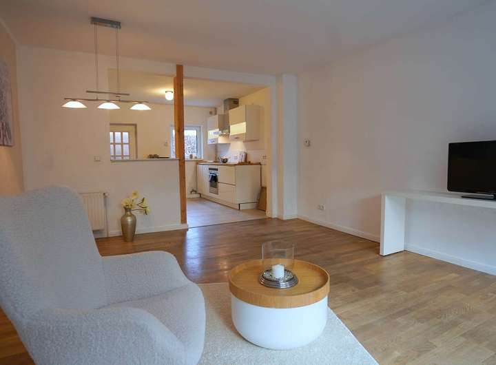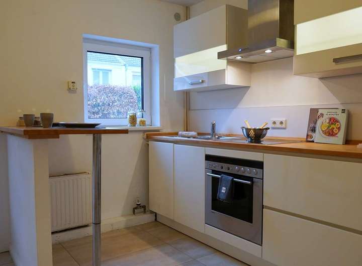 Beim Betreten des Hauses überblicken Sie sofort Ihren Wohnbereich mit angrenzender Terrasse und Garten. Die offen gestaltete Küche verfügt über Geschirrspüler und Platz für einen hohen Kühlschrank.