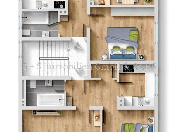 Die Bäder und Küchen sind verfliest, in den Wohnräumen ist teilweise Laminatboden verlegt.
