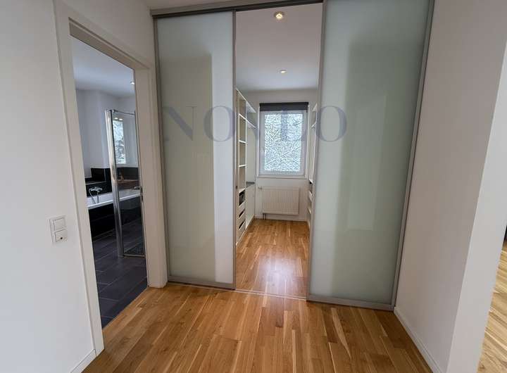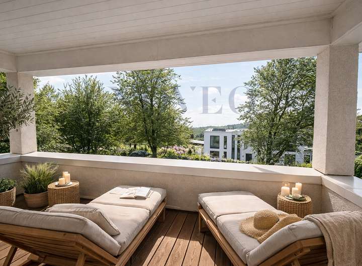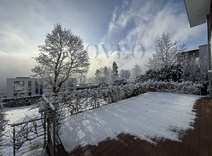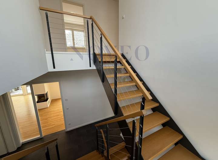 Über eine stilvolle Treppe im Holz-Stahl-Design gelangt man in das Obergeschoss. Hier stehen vier Schlafzimmer, ein Arbeitszimmer, zwei Bäder sowie ein Ankleidezimmer zur Verfügung. Ein besonderes Highlight bildet die sehr großzügige Eltern-Suite mit Designerbad, separatem Ankleideraum und Schlafzimmer mit Zugang zu einem überdachten Balkon. Hier genießen Sie das Wachwerden mit einer Tasse frischen Kaffee und einer grandiosen Aussicht.