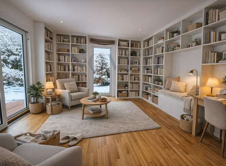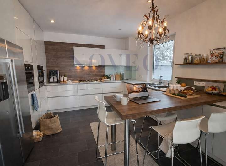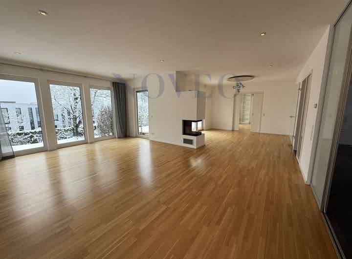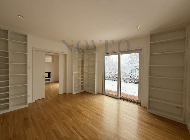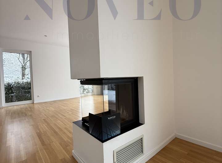 Herzstück des Hauses ist der offen gestaltete Wohn- und Essbereich mit bodentiefen Fenstern und offenem Kamin, der eine besondere Wohnatmosphäre schafft. Eine separate Bibliothek ergänzt den repräsentativen Bereich und kann – ebenso wie die großzügige Wohnküche – über raumhohe Glasschiebetüren flexibel zum Essbereich hin geöffnet werden. Auf dieser Ebene befinden sich zudem ein separater Gästebereich mit eigenem Badezimmer sowie ein hochwertiges Einbauschranksystem im Eingangsbereich. Die sich anschließende, mit WPC-Dielen ausgestattete Süd-Terrasse bietet viel Platz für Ihre Gäste, vergrößert in der warmen Jahreszeit Ihren Wohnraum ins Grüne und unterstreicht damit den besonderen Charakter dieser Immobilie.