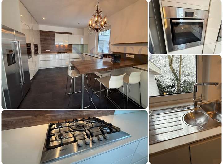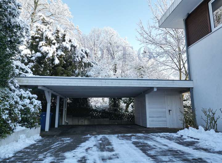 Im Gartengeschoss befindet sich ein großer Raum, der sich ideal als Hobbyraum oder als kombiniertes Arbeits- und Gästezimmer eignet und direkten Zugang in den Garten bietet. Ergänzt wird diese Ebene durch verschiedene Hauswirtschaftsräume. Die Immobilie ist unterkellert und verfügt neben der Terrasse und dem Balkon, über ein durchdachtes Außenangebot: Ein großer Carport für zwei Fahrzeuge sowie mindestens drei weitere Außenstellplätze runden das Gesamtbild ab. Die Villa ist ab sofort verfügbar und bietet eine seltene Kombination aus moderner Bauhaus-Architektur, hochwertiger Raumgestaltung und naturnaher Aussichtslage in Königstein im Taunus.