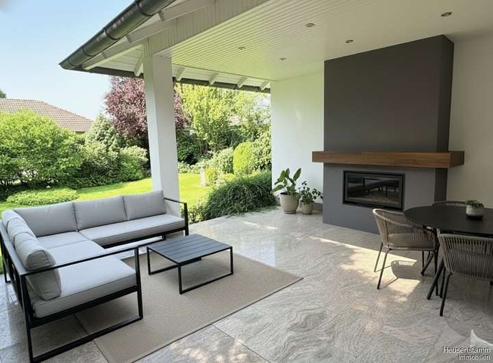 Der Außenbereich wurde von einem Landschaftsgärtner in einen privaten Park verwandelt. Ihre Abende verbringen Sie auf der teilweise überdachten Terrasse, die durch einen integrierten Kamin eine einzigartige Atmosphäre erhält.
