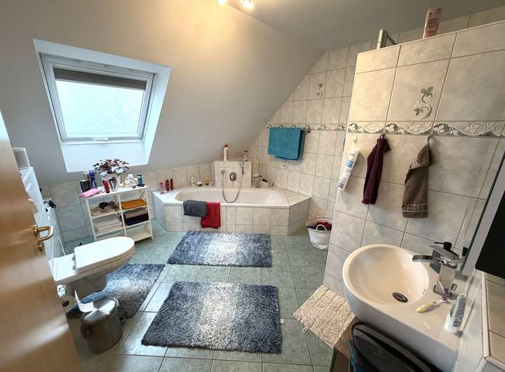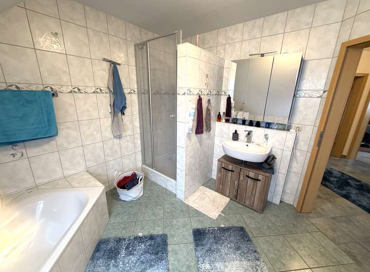 Das Badezimmer im OG bietet viel Platz mit Dusche und Badewanne. Auch die Vielzahl an Räumen im Haus erleichtert die Raumaufteilung mit Kindern oder Homeoffice.