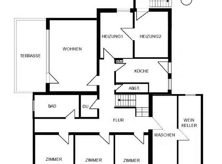 Das Gartengeschoss bietet vielseitige Nutzungsmöglichkeiten und erweitert die Wohnfläche um wertvolle Räume. Hier stehen drei Zimmer, ein Gästezimmer, ein Hobbyraum sowie ein Bad und eine zusätzliche Dusche zur Verfügung. Besonders hervorzuheben ist der direkte Zugang auf die große Terrasse – ideal für ein privates Fitnessstudio, eine Sauna oder als Gäste- und Arbeitsbereich. Außerdem gibt es eine weitere Küche, einen praktischen Abstellraum, einen Weinkeller sowie einen Hauswirtschaftsraum. Zwei separate Heizungsräume unterstreichen die durchdachte Planung.