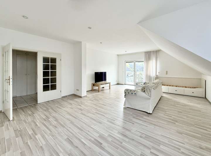 Die zweite Wohneinheit begeistert durch ihren besonderen Charme. Der Grundriss umfasst ein Wohnzimmer mit Zugang zum Balkon, einen separaten Essbereich mit angrenzender Küche, ein Eltern- sowie ein Kinderzimmer. Zudem stehen ein Bad und ein zusätzliches Duschbad zur Verfügung. Durch die Dachschrägen entsteht ein gemütliches Wohnambiente, das über die repräsentative Steintreppe erreicht wird.