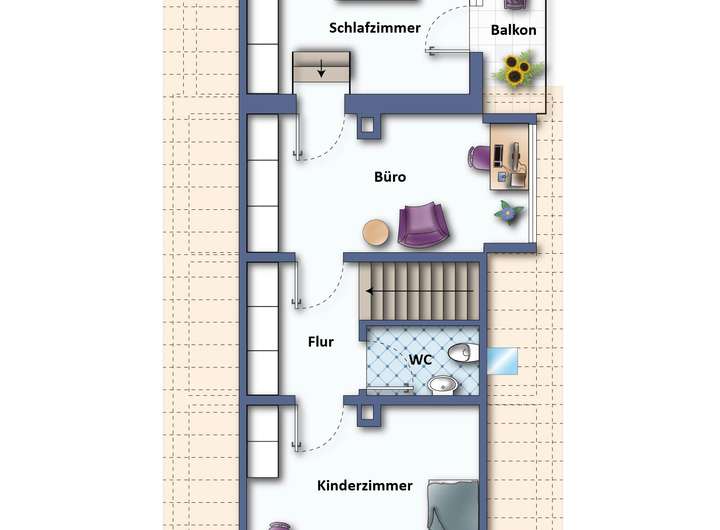 1 Flur, 1 Schlafzimmer mit Balkonzugang, 1 Durchgangszimmer (Büro), 1 Kinderzimmer, 1 Tageslicht-WC.