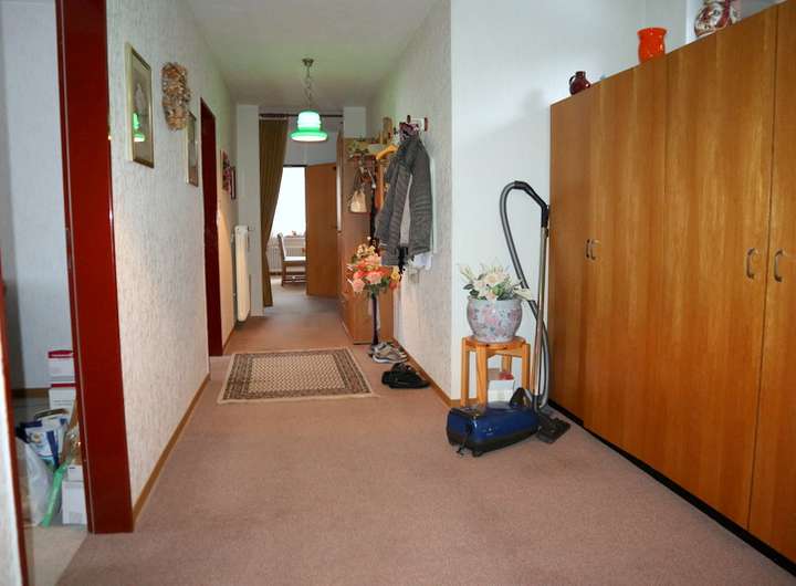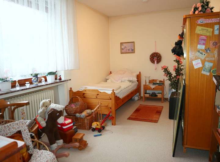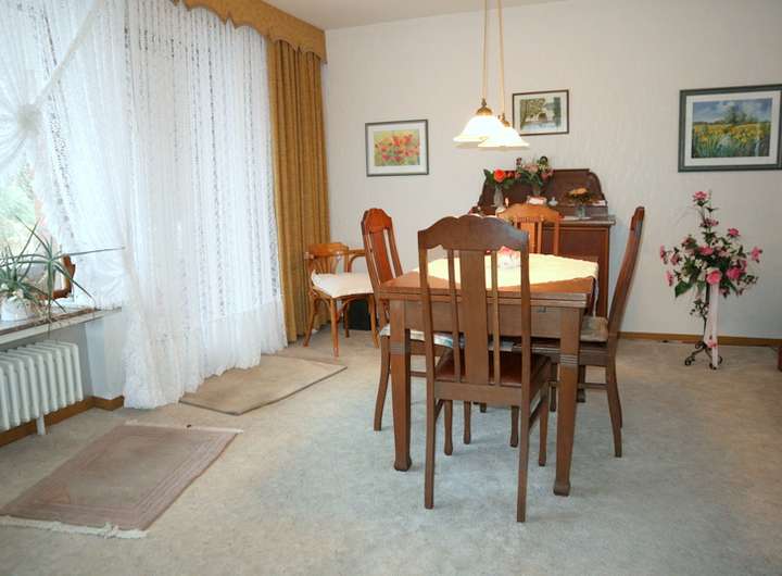 2 Flure mit Garderobenbereich und Zugang zum Kellergeschoss, 1 Küche inkl. älterer Einbauküche, 1 Esszimmer, 1 Wohnzimmer mit Zugang zur überdachten Südwest-Terrasse, 1 Tageslicht-Vollbad mit Dusche, Badewanne, Waschmaschinenanschluss & zwei Waschbecken, 1 Schlafzimmer, 2 Kinderzimmer, 1 Tageslicht-Gästetoilette.