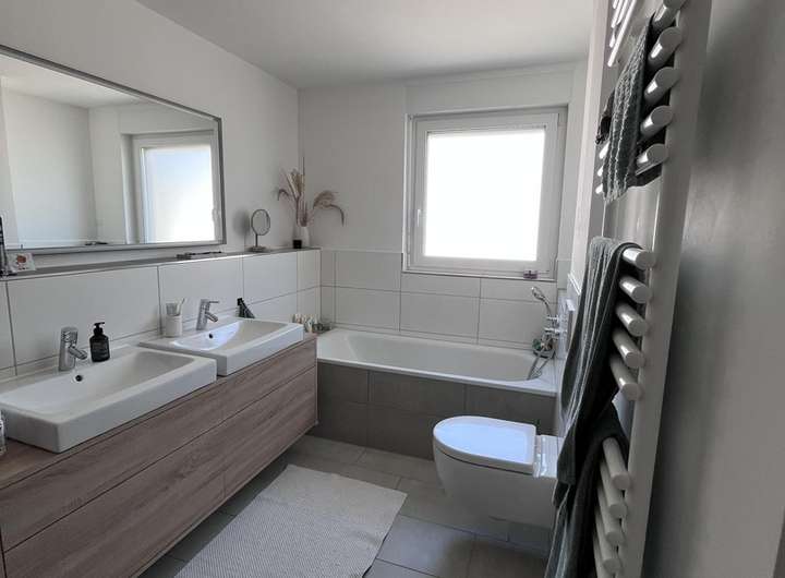 Die erste Etage bietet neben drei hellen Zimmern, welche sich ideal als Schlaf-/ Kinderzimmer oder Büro eignen, ein helles und modernes Badezimmer mit zwei Waschbecken, Wachtisch, Badewanne sowie großer Dusche mit Glasabtrennung.
