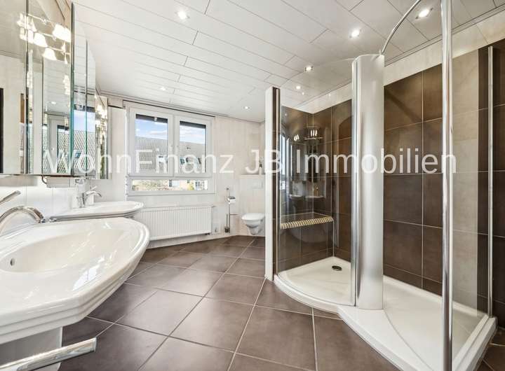 - Großes, gepflegtes Badezimmer mit ebenerdiger Dusche und zwei Waschbecken