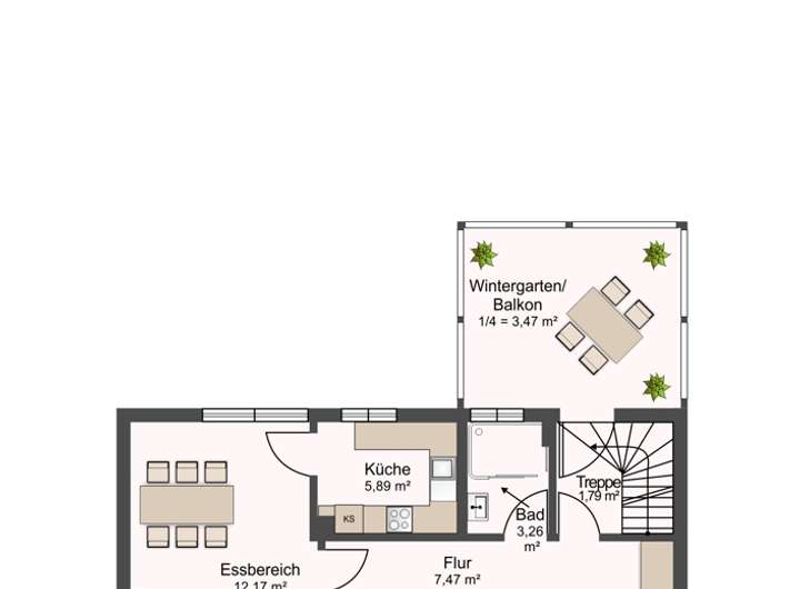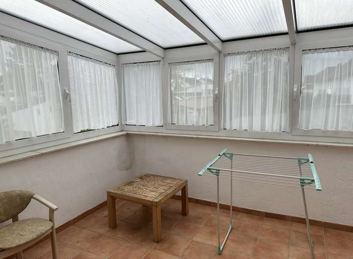 Das Obergeschoss bietet einen teils als Wintergarten ausgebauten Balkon, der je nach Wunsch wieder zurückgebaut werden kann. Ein Schlafzimmer mit direktem Zugang zu einem großzügigen Badezimmer mit Whirlpoolbadewanne, zwei Waschbecken und raumhoher Verfliesung sorgt für Komfort. Die Küche ist mit einer Einbauküche ausgestattet und durch einen offenen Übergang mit dem angrenzenden Essbereich verbunden. Ein weiteres Tageslichtbad mit Dusche, ein Einbauschrank sowie praktische Abstellmöglichkeiten im Flurbereich ergänzen diese Etage.
