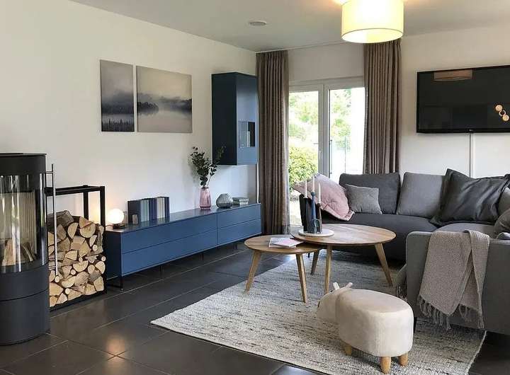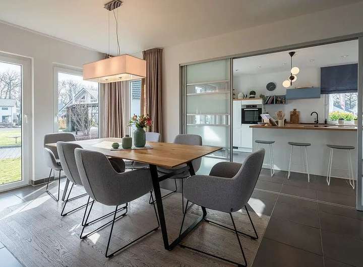 Im Erdgeschoss sorgen bodentiefe Fensterflächen für lichtdurchflutete Räume und eine offene, einladende Atmosphäre. Die fließenden Übergänge zwischen Küche, Essbereich und Wohnen bilden eine stimmige Einheit und schaffen ein modernes Wohngefühl mit viel Freiraum.
