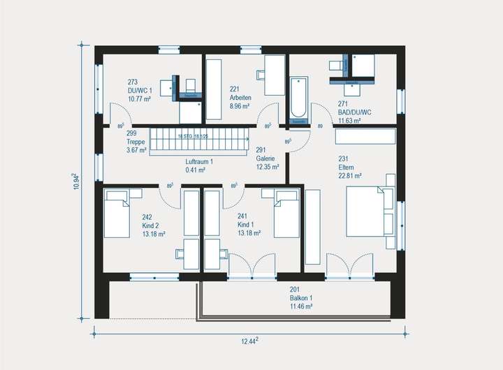 Im Obergeschoss setzt sich das durchdachte Raumkonzept konsequent fort. Zwei Kinderzimmer mit eigenem Bad, ein weiterer Arbeitsraum und der großzügige Elternbereich mit Ankleide und hochwertigem Wellnessbad bieten ideale Voraussetzungen für entspanntes Familienleben auf hohem Niveau.